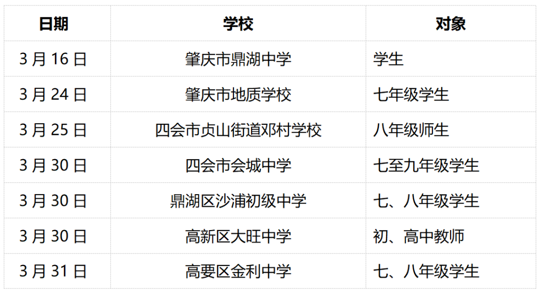 春光正好,心育同行。2026年3月,广东省心理卫生协会继续携手共青团肇庆市委员会、肇庆市教育局、中山大学附属第三医院肇庆医院,深入推进“心‘肇’阳光,青春绽放”12355心理健康服务护航青少年成长系列活动。在过去的一个月里,协会委派的专家团队先后走进肇庆市多所中小学校,圆满完成7场心理健康主题讲座与互动活动,为新一年的青少年心理健康护航行动拉开了坚实序幕。【点击链接查看2025年该公益项目情况:专业力量下沉一线,协会集结专家力量,倾情护航肇庆青少年阳光成长】3月活动回顾:专业力量精准对接校园需求自2025年6月项目启动以来,广东省心理卫生协会派出协会会员、精神心理专家张明、李冠英、陈敏华、曲峰蕾、丁凯荣、何泳怡、韩云武、卢炳烂等,深入肇庆各县(市、区)学校开展心理健康服务。截至2026年3月底,协会专家团队已累计完成21场活动(2025年14场,2026年3月7场),覆盖学生、教师、家长等群体逾千人次,持续将专业的心理知识以温暖、易懂的方式送入校园。三月活动一览:专业护航,持续发力根据项目整体规划,2025-2026年计划完成37场系列活动。3月份7场活动的顺利开展,标志着本年度心理健康服务进校园工作已进入高效推进阶段。接下来,广东省心理卫生协会将继续联合主办单位,按计划深入肇庆市各县(市、区)剩余21场 活动,形式包括心理专家主题讲座、12355热线专项推广、心理游园会、教师减压工作坊、线上家长课堂等,全方位覆盖学生、教师、家长三大群体。协会专家团队将继续依托12355青少年服务热线及“肇庆青年”等新媒体平台,为青少年提供长期、稳定、专业的心理支持,同时协助学校建立健全心理危机干预与预警机制,真正实现“月月有活动,人人可求助”。多方协作,共育阳光心灵本次与肇庆市团委、教育局、中山三院肇庆医院的深度合作,是广东省心理卫生协会践行社会责任、服务青少年心理健康的又一次重要实践。我们将继续以专业为根基、以爱心为纽带,携手各方力量,把心理健康知识送到更多孩子、家长和教师身边,助力广东省心理健康教育、医疗资源薄弱地区构建全方位、全周期的青少年心理健康服务体系。心理健康不是一朝一夕之功,需要我们持之以恒地陪伴、倾听、引导。接下来,协会将继续发挥专家团队优势,确保每一场活动有温度、有实效,为肇庆青少年的阳光成长贡献专业力量。心“肇”阳光,青春绽放——我们一直在行动。
