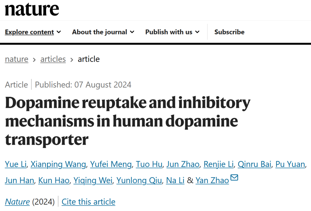 多巴胺转运体通过摄取多巴胺进入神经元,在多巴胺能神经传递的调节中起着至关重要的作用,并有治疗精神运动兴奋剂滥用的潜力。尽管经过几十年的研究,人类多巴胺转运体的结构、底物结合、构象转变和药物结合姿势仍然未知。2024年8月7日,中国科学院生物物理研究所赵岩团队在Nature在线发表题为“Dopamine reuptake and inhibitory mechanisms in human dopamine transporter”的研究论文,该研究利用单颗粒冷冻电镜技术解析了人源多巴胺转运蛋白DAT未结合底物、结合底物多巴胺、结合治疗ADHD药物哌醋甲酯、结合抑制剂GBR12909以及结合Benztropine的五个高分辨率结构。封闭状态下的多巴胺结合结构精确地说明了多巴胺及其相关离子的结合位置。与药物结合的结构以外向或内向的状态被捕获,阐明了底物运输过程中不同的结合模式和构象转变。与可卡因稳定的外向状态不同,GBR12909和苯托品将多巴胺转运蛋白稳定在内向状态,揭示了以前看不见的药物结合姿势,并为它们如何抵消可卡因的影响提供了见解。该研究为理解人类多巴胺转运体的功能和开发多巴胺转运体相关疾病和可卡因成瘾的治疗干预措施建立了一个框架。可卡因成瘾是一个世界性的公共问题,影响着美国4100多万人。可卡因的运动刺激作用和奖励作用主要源于其对DAT的抑制,导致细胞外多巴胺的快速和过度积累。考虑到多巴胺转运体在可卡因成瘾特性中的关键作用,针对DAT的药物开发代表了从药理学上解决可卡因滥用的逻辑策略。先前的研究表明,尽管GBR12909、苯托品及其衍生物是多巴胺再摄取的有效抑制剂,但它们不会在小鼠和恒河猴中引起类似可卡因的运动活动或自我给药。相反,这些化合物能够减少可卡因的自我给药和可卡因歧视,这表明它们有可能治疗可卡因成瘾。然而,在人类受试者中使用GBR12909的临床研究由于对心室去极化-复极化间隔的速率依赖效应的出现而终止。深入了解这种药物的结合位姿对其进一步优化至关重要。