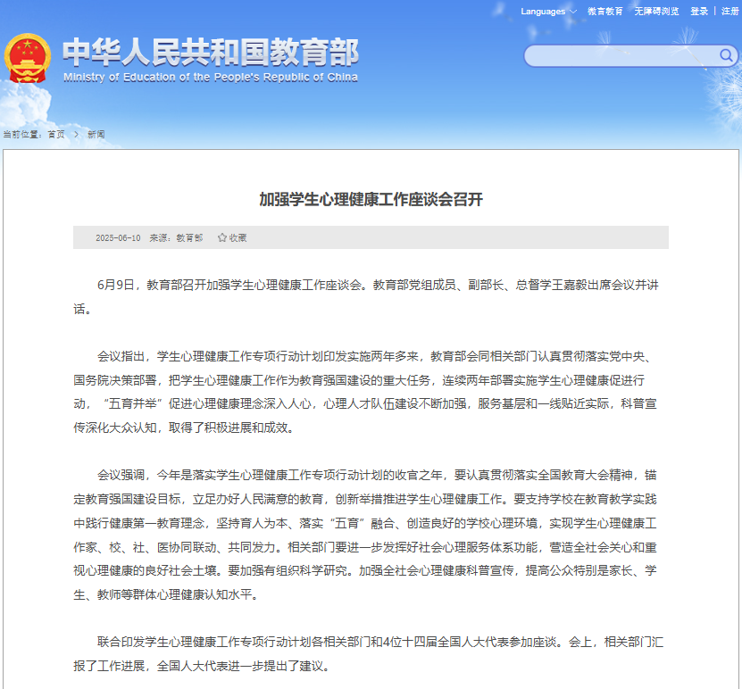 6月9日,教育部召开加强学生心理健康工作座谈会。教育部党组成员、副部长、总督学王嘉毅出席会议并讲话。会议指出,学生心理健康工作专项行动计划印发实施两年多来,教育部会同相关部门认真贯彻落实党中央、国务院决策部署,把学生心理健康工作作为教育强国建设的重大任务,连续两年部署实施学生心理健康促进行动,“五育并举”促进心理健康理念深入人心,心理人才队伍建设不断加强,服务基层和一线贴近实际,科普宣传深化大众认知,取得了积极进展和成效。会议强调,今年是落实学生心理健康工作专项行动计划的收官之年,要认真贯彻落实全国教育大会精神,锚定教育强国建设目标,立足办好人民满意的教育,创新举措推进学生心理健康工作。要支持学校在教育教学实践中践行健康第一教育理念,坚持育人为本、落实“五育”融合、创造良好的学校心理环境,实现学生心理健康工作家、校、社、医协同联动、共同发力。相关部门要进一步发挥好社会心理服务体系功能,营造全社会关心和重视心理健康的良好社会土壤。要加强有组织科学研究。加强全社会心理健康科普宣传,提高公众特别是家长、学生、教师等群体心理健康认知水平。联合印发学生心理健康工作专项行动计划各相关部门和4位十四届全国人大代表参加座谈。会上,相关部门汇报了工作进展,全国人大代表进一步提出了建议。来源:教育部官网
