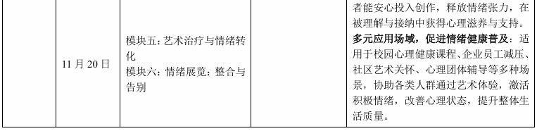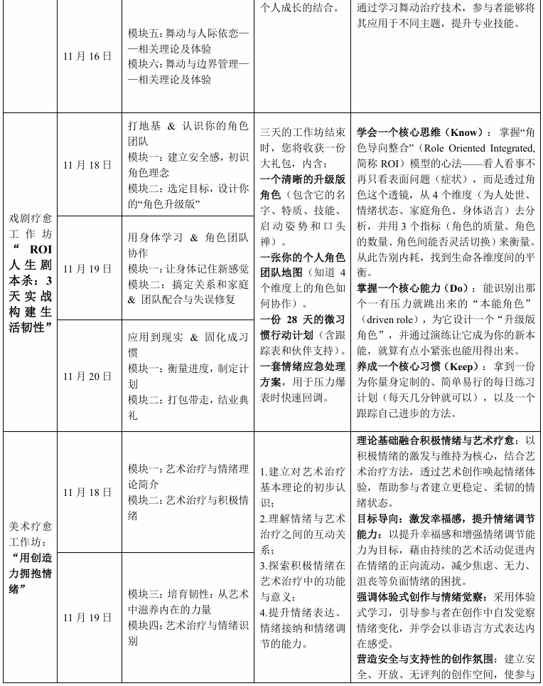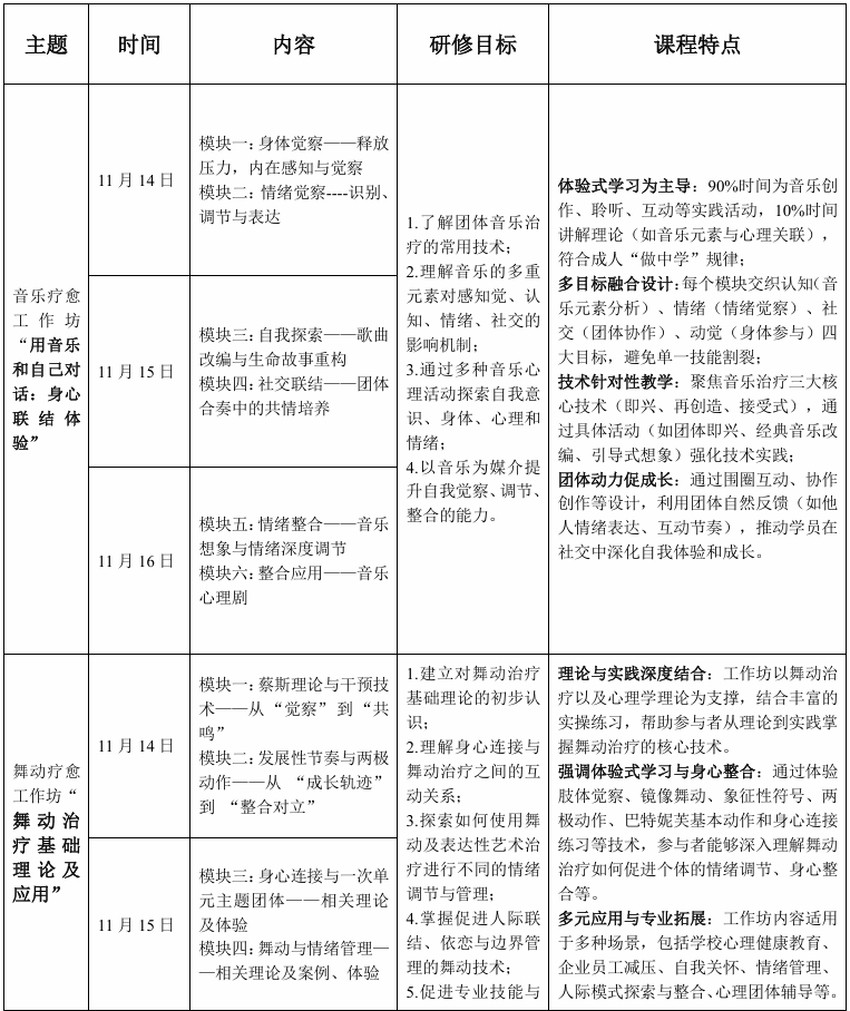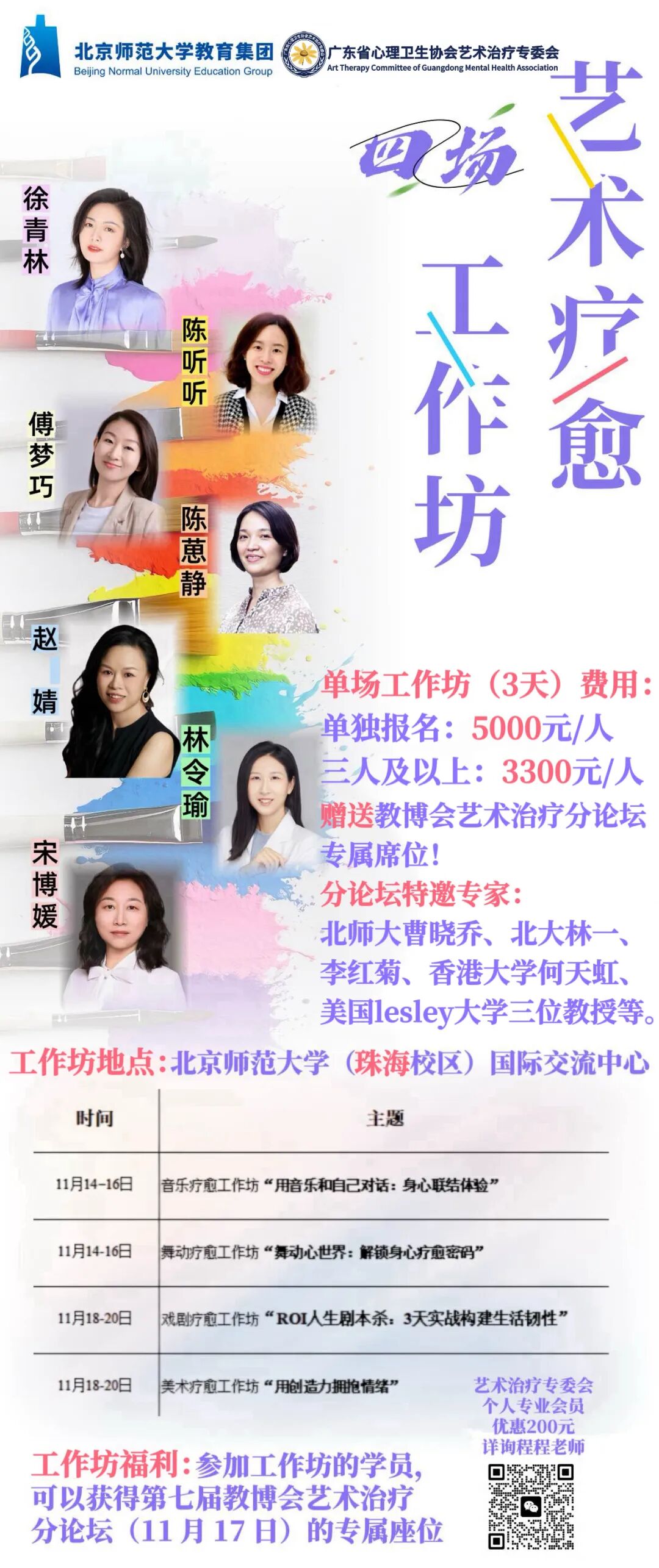 各地医疗机构、院校、艺术治疗相关单位:艺术治疗作为一种跨学科的疗愈方法,在全球范围内得到了广泛的关注和应用,尤其在欧美国家,艺术治疗已经成为心理健康领域的重要组成部分。随着我国社会对心理健康重视程度的提升,艺术治疗也逐渐受到重视,并在高校和研究机构中得到发展。北京师范大学等高校在艺术治疗的理论研究、人才培养和实践应用方面展现出显著优势,推动了艺术治疗理论与实践的结合。为进一步培养艺术治疗领域相关人才,广东省心理卫生协会艺术治疗专委会联合北京师范大学教育集团拟于2025年11月开展四场艺术疗愈工作坊(包含舞动治疗、戏剧治疗、音乐治疗、美术治疗)研修活动,热忱欢迎各界人士积极参与,共促艺术治疗领域人才发展。特此通知附件:1.艺术疗愈工作坊研修具体安排 2.艺术疗愈工作坊研修报名表附件一艺术疗愈工作坊研修具体安排一、研修简介为进一步培养艺术治疗领域相关人才,将于11月14至16日、18至20日分别举办两场专项工作坊,共四场工作坊,热忱欢迎各界人士积极参与,共促艺术治疗领域人才发展。二、主办单位广东省心理卫生协会广东省心理卫生协会艺术治疗专委会北京师范大学教育集团三、参研人员1.心理健康专业人士 2.艺术疗愈实践者 3.教育工作者 4.医疗机构及社区服务工作者 5.对艺术疗愈感兴趣的公众工作坊无需艺术专业背景,欢迎所有对艺术心理体验有兴趣的朋友。四、教育目标1.培养学校和文化社区的艺术疗愈人才。2.提高艺术/心理教育/咨询工作者的素质和技能。五、研修专家赵 婧 若芽心理(Roiya)创始人&临床总监、ROI(角色导向整合)模型研发者、美国加州整合学院(California Institute of Integral Studies)行为科学博士(人类性学方向)、咨询心理硕士(戏剧治疗方向)、持加州独立执业执照的婚姻与家庭治疗师(LMFT)、北美戏剧治疗协会认证的注册戏剧治疗师(RDT)。擅长处理婚姻家庭问题、亲密关系挑战、复杂型创伤、情绪调节及心理矫治等。独立研发的角色导向整合模型(Role Oriented Integrated Model, 简称ROI)已获得实证研究的支持,为体验式疗法在临床实践中的应用提供了重要的理论依据和实践经验。创作首部半纪实心理小说《心洞》,领衔翻译《成长预演:在即兴中疗愈》,独立翻译《成长预演从业者手册》,为戏剧治疗在中国的普及和发展做出了重要贡献。傅梦巧 北京师范大学未来教育学院副教授、硕士生导师,2016年赴美国学习舞动治疗的临床运用,北京师范大学舞蹈治疗专业专任教师。主讲课程:身心舞动疗法与实践;肢体动作观察与解析:KMP;身心合一理论与实践。曾获校级 “优秀青年教师奖”“优秀课程奖”,多次获得教师教学基本功大赛奖励。近年来主持及参与科研项目 6 项,主持教学改革项目 4项,发表学术论文十余篇。徐青林 北京高校心理中心专职教师、北京师范大学心理学部博士候选人、北师大心理学部外聘督导师、注册德国舞动治疗师(BTD?Dance Therapist)、注册心理师、注册督导师(CPS 中国心理学会临床与咨询心理学专委会注册系统)、中国心理卫生协会妇女健康与发展专业委员会青年委员。临床咨询经验丰富,擅长运用舞动治疗结合多种艺术媒介(如视觉艺术、声音、音乐、心理剧、诗歌等)开展表达性艺术治疗整合干预。多次应邀在中国科学院大学、清华大学、中国人民大学、北京师范大学等国内知名高校授课。曾担任北京师范大学心理学部防疫心理援助热线平台心理咨询师与心理督导师、教育部华中师范大学心理援助热线平台心理咨询师,与中华少年儿童慈善救助基金会、北京青少年服务中心合作,为特殊儿童、青少年及家长提供心理健康服务。近年来主持和参与各级科研项目10项,发表学术论文十余篇。合作出版撰写、译著心理学相关著作6部著作,合著《舞动地图-115个身心舞动练习》,译著《动作的意义:凯斯腾伯格动作侧写理论的具身发展、临床和文化视角》。陈葸静 中国科学院心理研究所助理研究员、硕士生导师、中国科学院心理研究所博士后、Aalborg University(丹麦)音乐治疗专业博士、中央音乐学院音乐治疗专业硕士。中国音乐治疗学会副秘书长、中国商业企业管理协会音乐治疗师行业委员会副主任委员、中国抗癌协会肿瘤音乐干预专委会副主任委员、中国心理学会临床与咨询心理学专业委员会艺术治疗学组音乐治疗学组组长、北京保护健康协会专家委员会专家。主要聚焦音乐与心理健康的心理机制研究,数字化音乐干预的研发和多场景应用,团体音乐心理治疗对于亚健康人群、情绪障碍人群、服刑人员、以及成瘾人群的临床和研究工作。参与国家自然科学基金、科技部创新2030创新脑计划资助课题多项;与国际同行发表音乐治疗对抑郁、物质成瘾、精神分裂症的疗效的Cochrane review 4篇;担任2个国际期刊编委,多个国际期刊审稿人,已发表SCI, SSCI论文20余篇。宋博媛 音乐学博士、南京特师音乐与舞蹈学院音乐治疗系专任教师、副教授、二级心理咨询师。中国音乐治疗学会会员、中国传统音乐学会会员、中国世界民族音乐学会会员、韩国亚细亚音乐学会会员、教育部中西部高校青年骨干教师访问学者。中国音乐学院音乐学研究所音乐治疗学研修结业(导师张鸿懿教授,2008);中国音乐治疗师行业委员会音乐治疗师初级、中级课程结业(2014、2019);