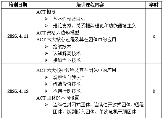 本次培训,我们将重点教授ACT团体实践技能,同时探索如何在有限的资源下最大化其治疗效果,以期为来访者提供更高效、更有效的团体治疗体验。