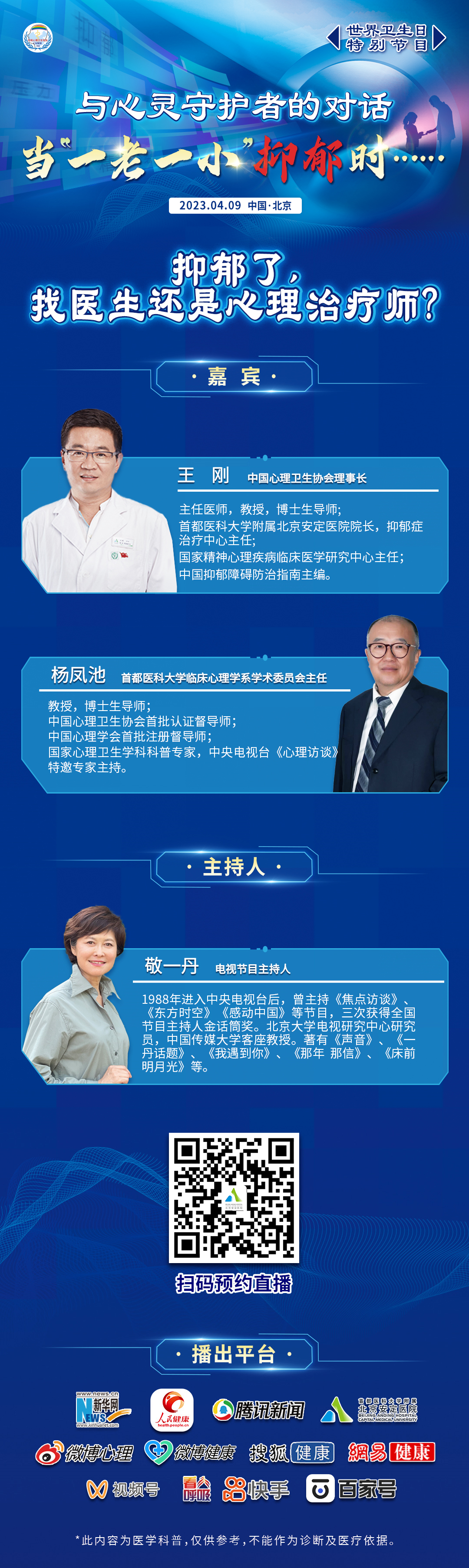 为了帮助大家“烧香找到庙门”,中国心理卫生协会将在4月9日晚上19:00-20:00,邀请精神心理学界的知名专家教授,面向公众进行一场名为《当“一老一小”抑郁时——与心灵守护者的对话》的第三场直播。