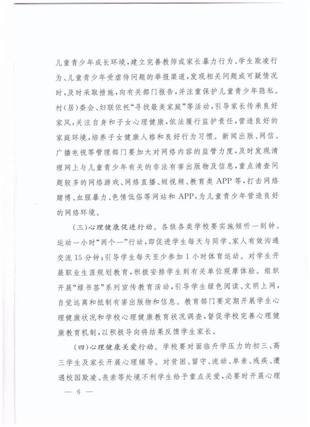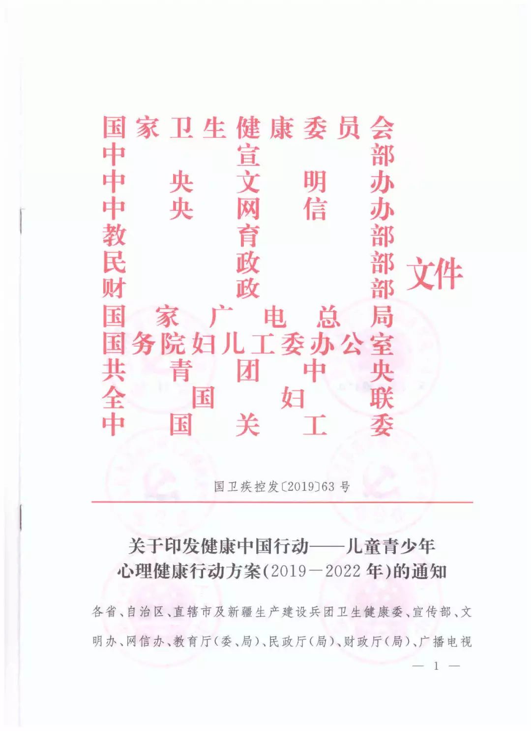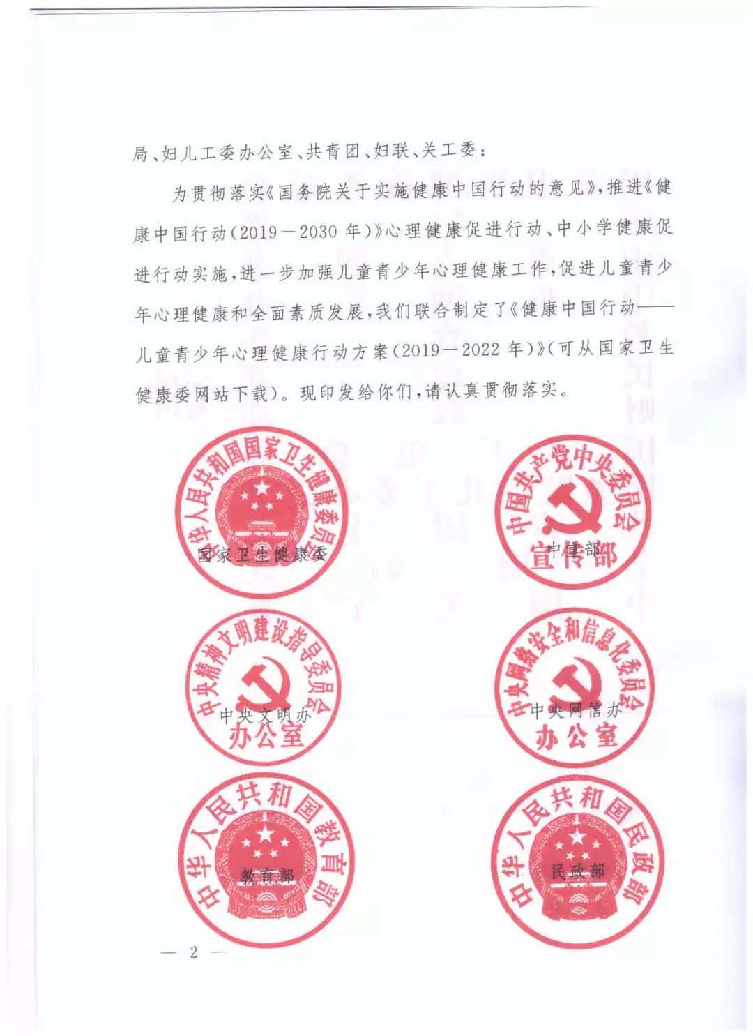 随着我国经济社会快速发展,儿童青少年心理行为问题发生率和精神障碍患病率逐渐上升,已成为关系国家和民族未来的重要公共卫生问题。为贯彻落实党中央、国务院决策部署,落实《国务院关于实施健康中国行动的意见》,促进儿童青少年心理健康和全面素质发展,近日,国家卫生健康委、中宣部、中央文明办、中央网信办、教育部、民政部、财政部、国家广电总局、国务院妇儿工委办公室、共青团中央、全国妇联、中国关工委联合印发《健康中国行动——儿童青少年心理健康行动方案(2019-2022年)》,大家一起来学习领会文件精神吧。